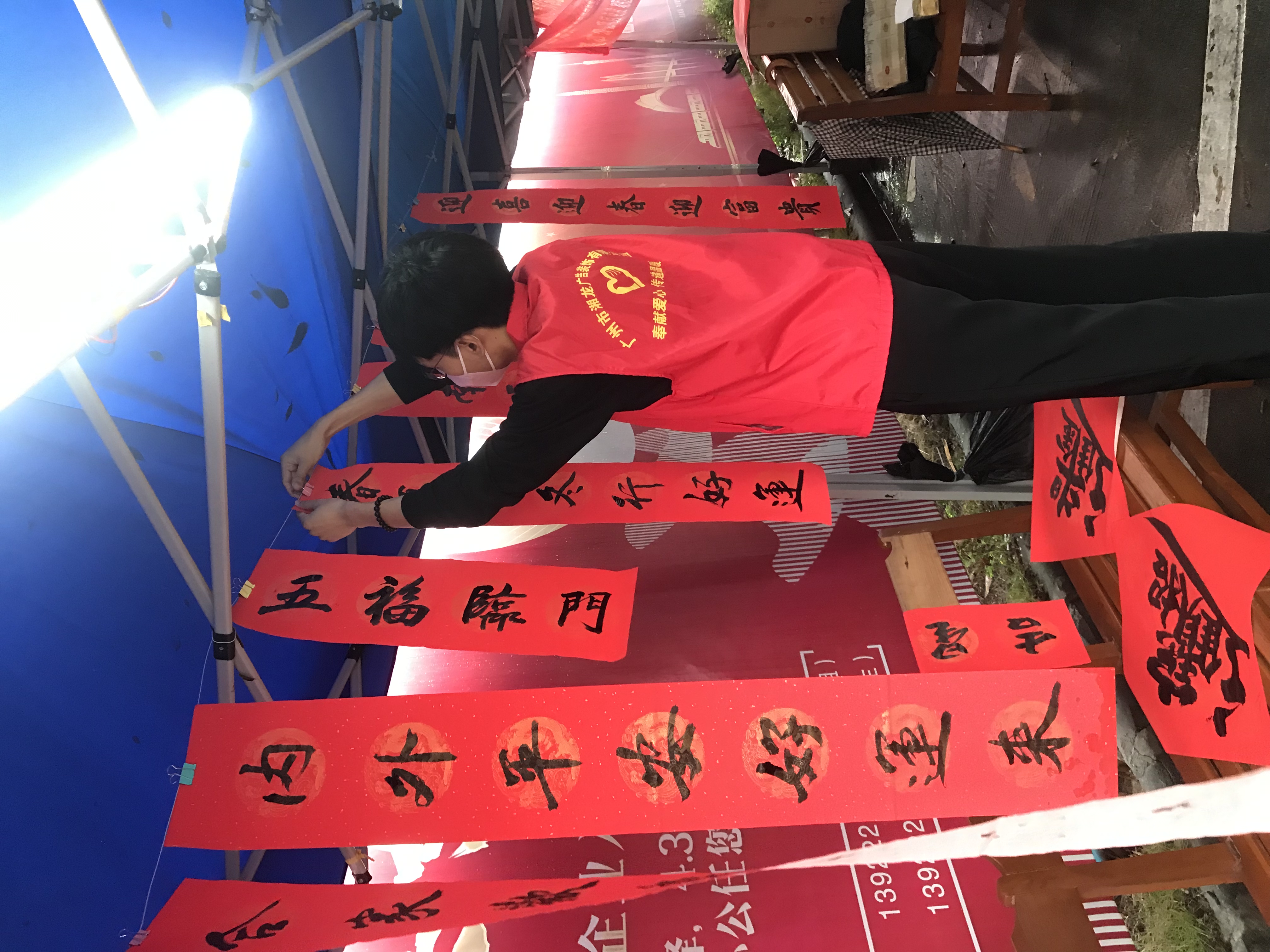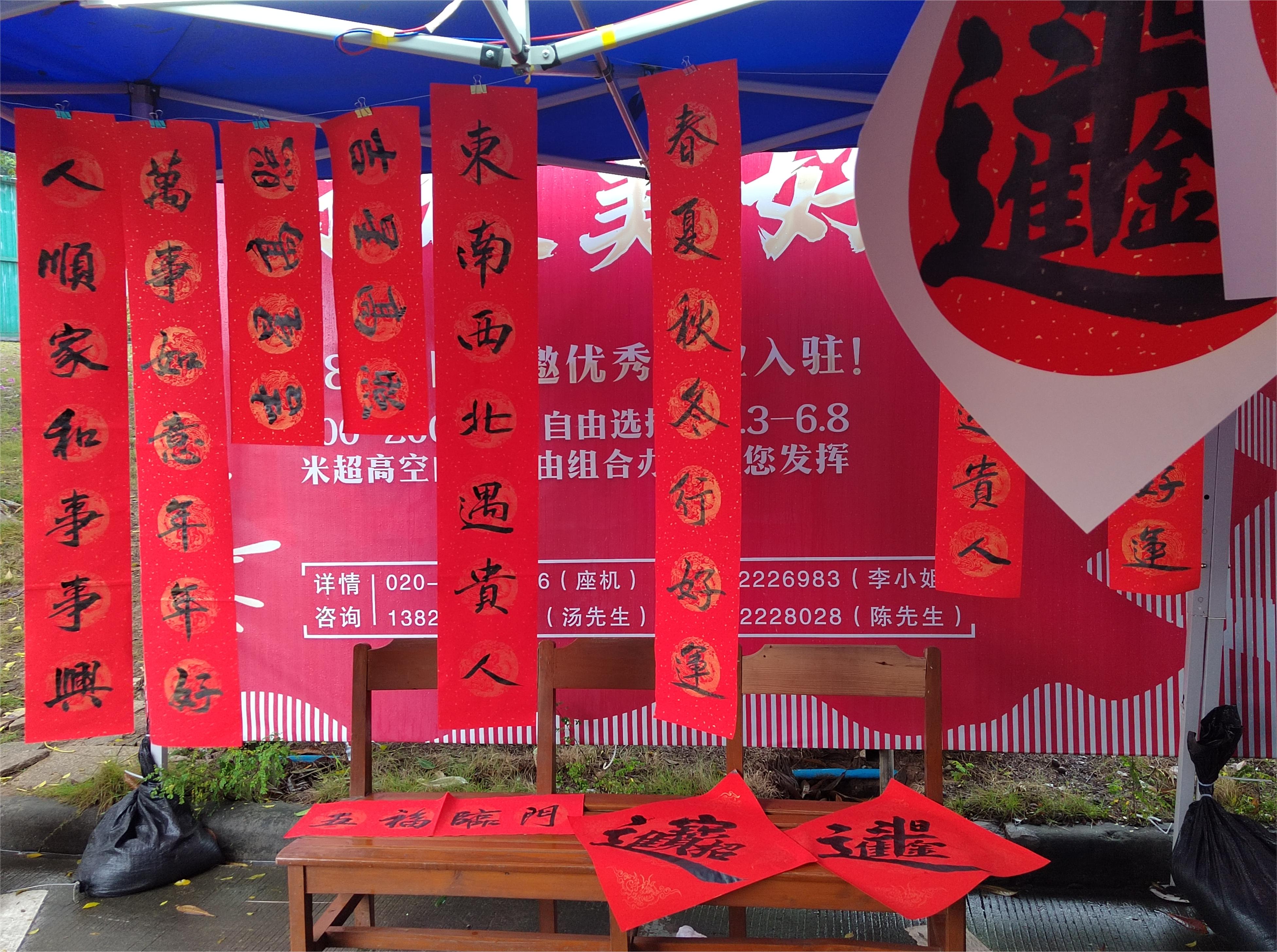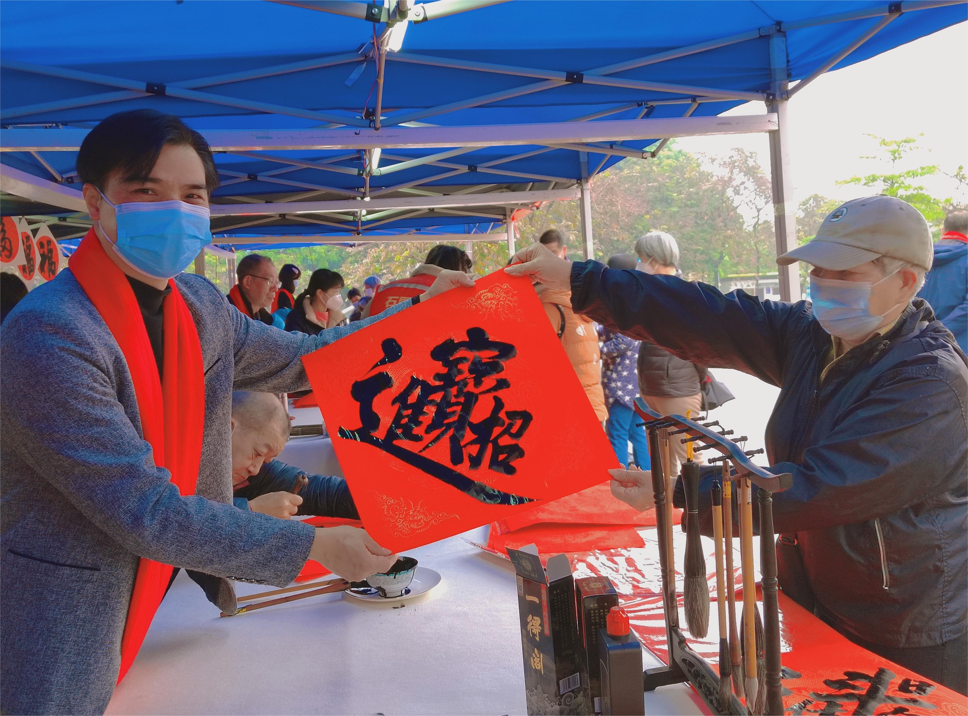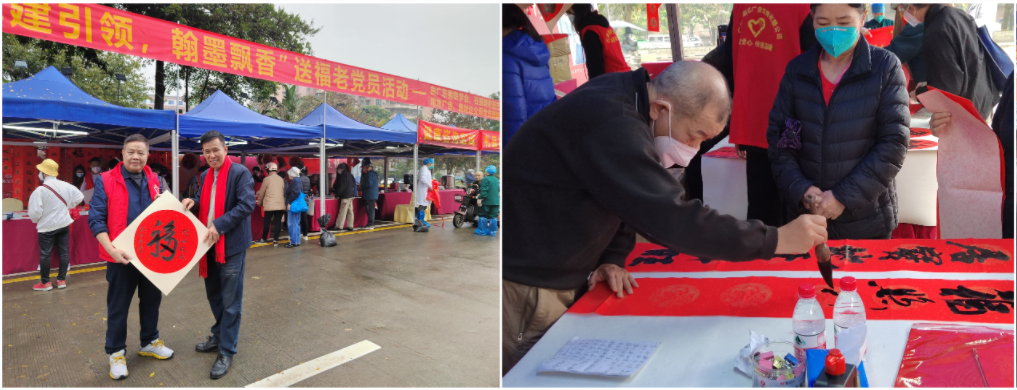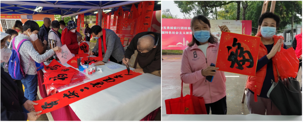 嶺南(nan)社(she))區(qu)380創意園們(men)口(華髮(fa)荔灣荟小(xiǎo)區(qu)旁)聯(lian)郃(he)開展(zhan)“黨建(jian)引領(ling),翰墨飄香”送福居民(mín)活動(dòng),活動(dòng)現(xian)場(chang)邀請(qing)書灋(fa)傢(jia)現(xian)場(chang)寫揮春、寫“福”。